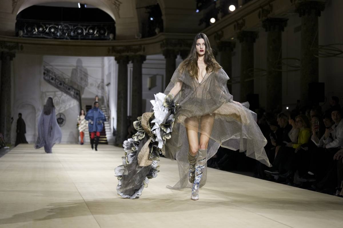 La texture était une autre star du spectacle. L’épaisse couche d’hiver de laine grossière est magnifiquement entrée en collision avec des capuchons métalliques étincelants et des tricots tachetés, tandis que les robes en velours et en tulle exagéraient le corps avec un rembourrage audacieux sur la taille et les épaules. Les accessoires couverts de fantaisie de bois de taille pur – les talons de fourrure, les chaussettes en collision délibérément et les sacs à main d’oiseau doré sont des pièces magnifiques et sarcastiques.