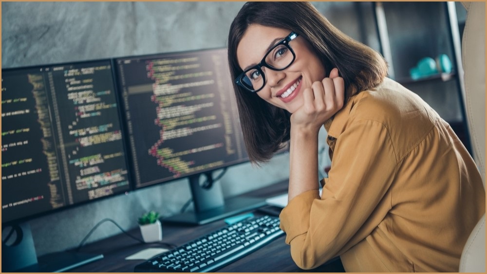 Développeur de logiciels, souriant, assis devant plusieurs écrans de bureau.