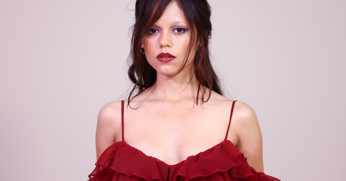 Samedi, Ortega a assisté à un spectacle pour Ande Merry Maetel, une marque connue pour son ADN gothique. Naturellement, elle portait un tailleur-pantalon en satin gris pour guider l’ambiance au premier rang. Cela comprenait une veste de style régiment coupé et un pantalon évasé subtilement. Au lieu des chemisiers et des boutones habituels qui étaient généralement portés dans les costumes, Ortega a opté pour des sous-vêtements avec des crampons à volants victoriens avec des poignets en plumes et des ceintures à volants qui dépassent de son pantalon.