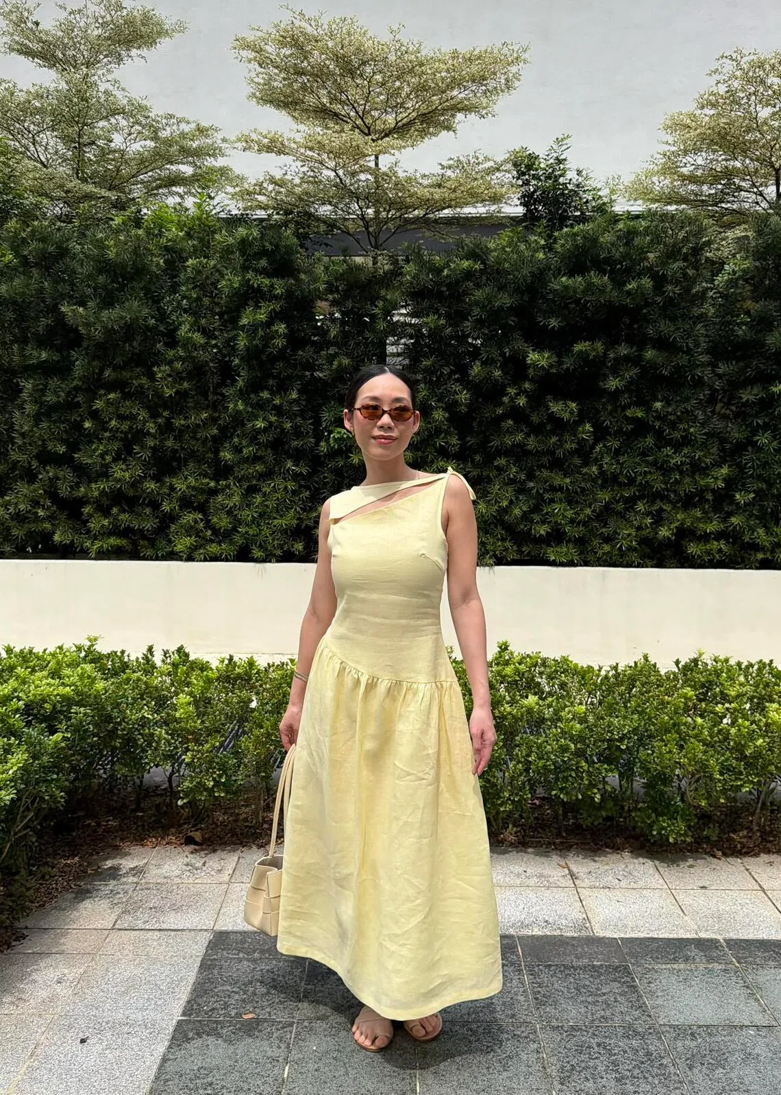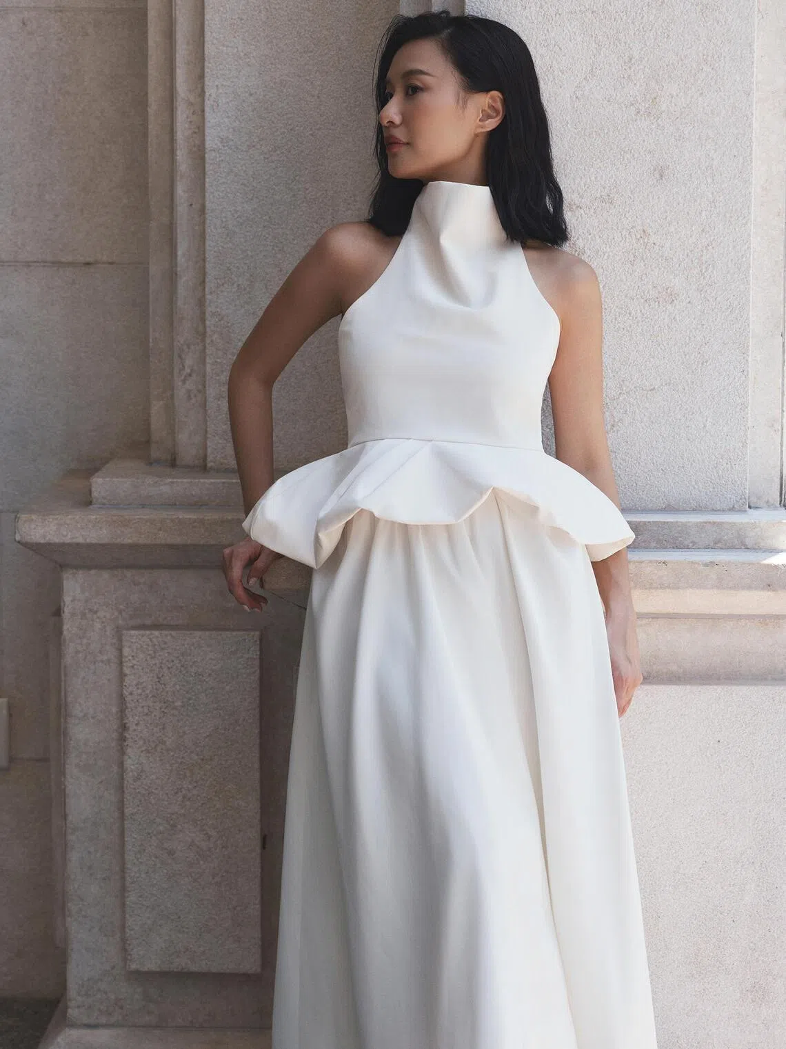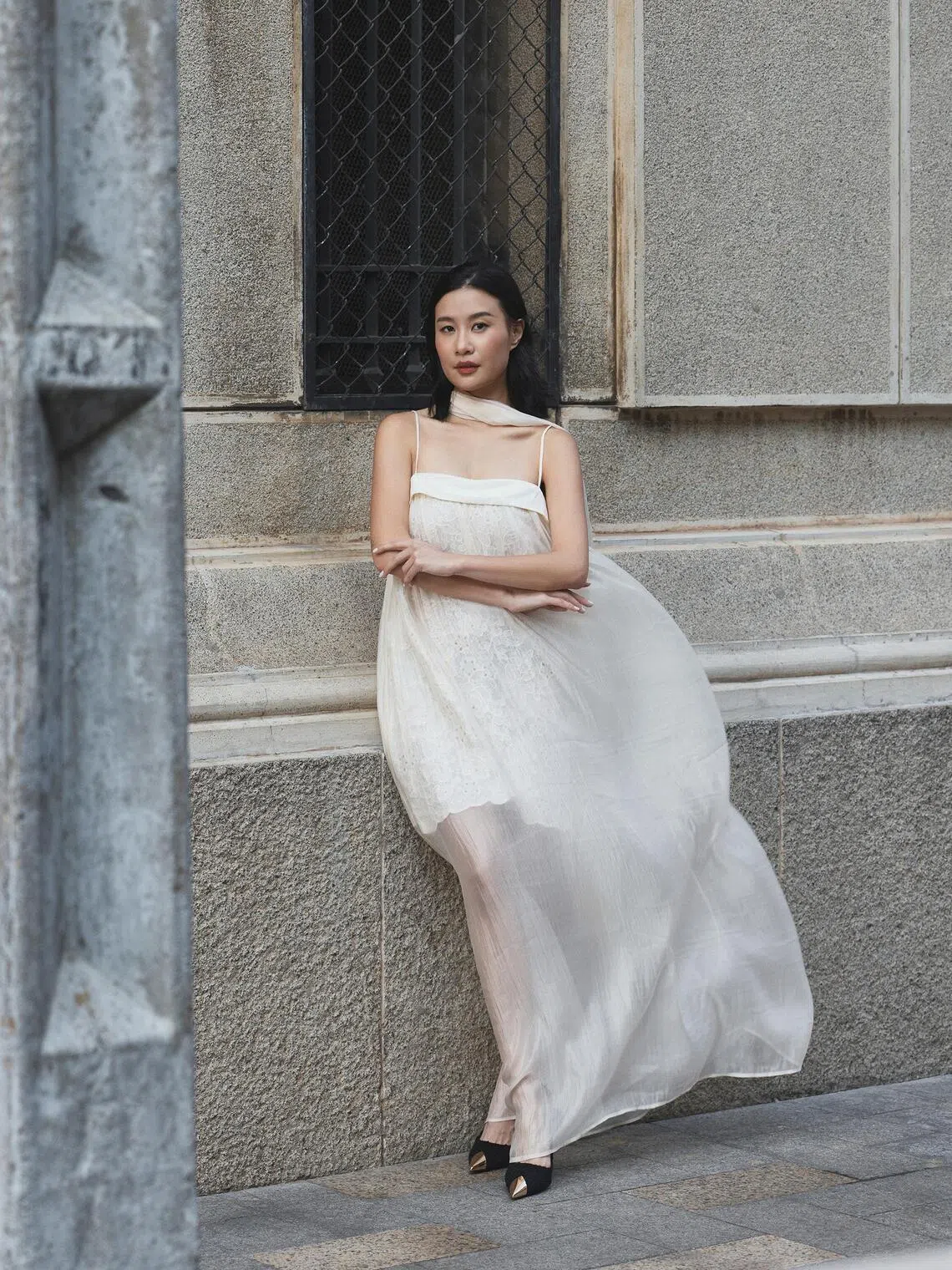 Sarina Chai porte une robe de la collection City Romanticism de la marque indonésienne Gemme Clothing.