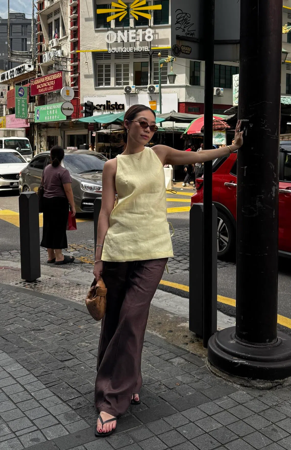 Debra Jane porte un haut long à ruban et un pantalon plissé créé en collaboration avec la marque malaisienne Li’s Atelier.