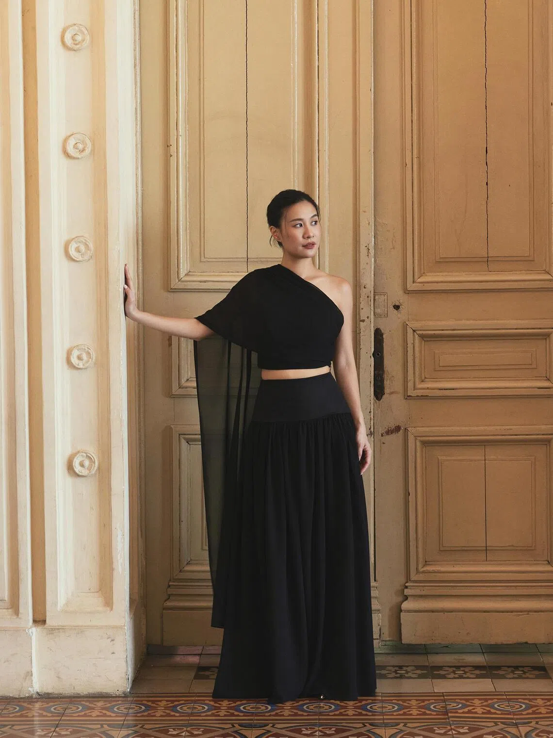 Sarina Chai porte un ensemble en mousseline avec un haut drapé multidirectionnel et une jupe fluide de la collection Gemme Clothing.