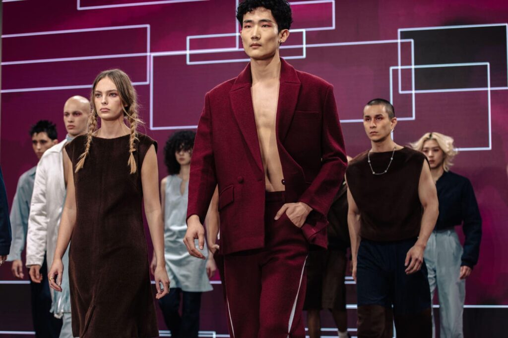 La conception de sacs appariées de Rickyy Wong a été faite avec une couture zéro déchet, mais c’était une approche moderne de la vie urbaine. Le coton ciré ou les magnifiques vestes de kiosque en laine d’alpaga, les manteaux longs et les costumes se réfèrent à une esthétique sobre et attrayante.